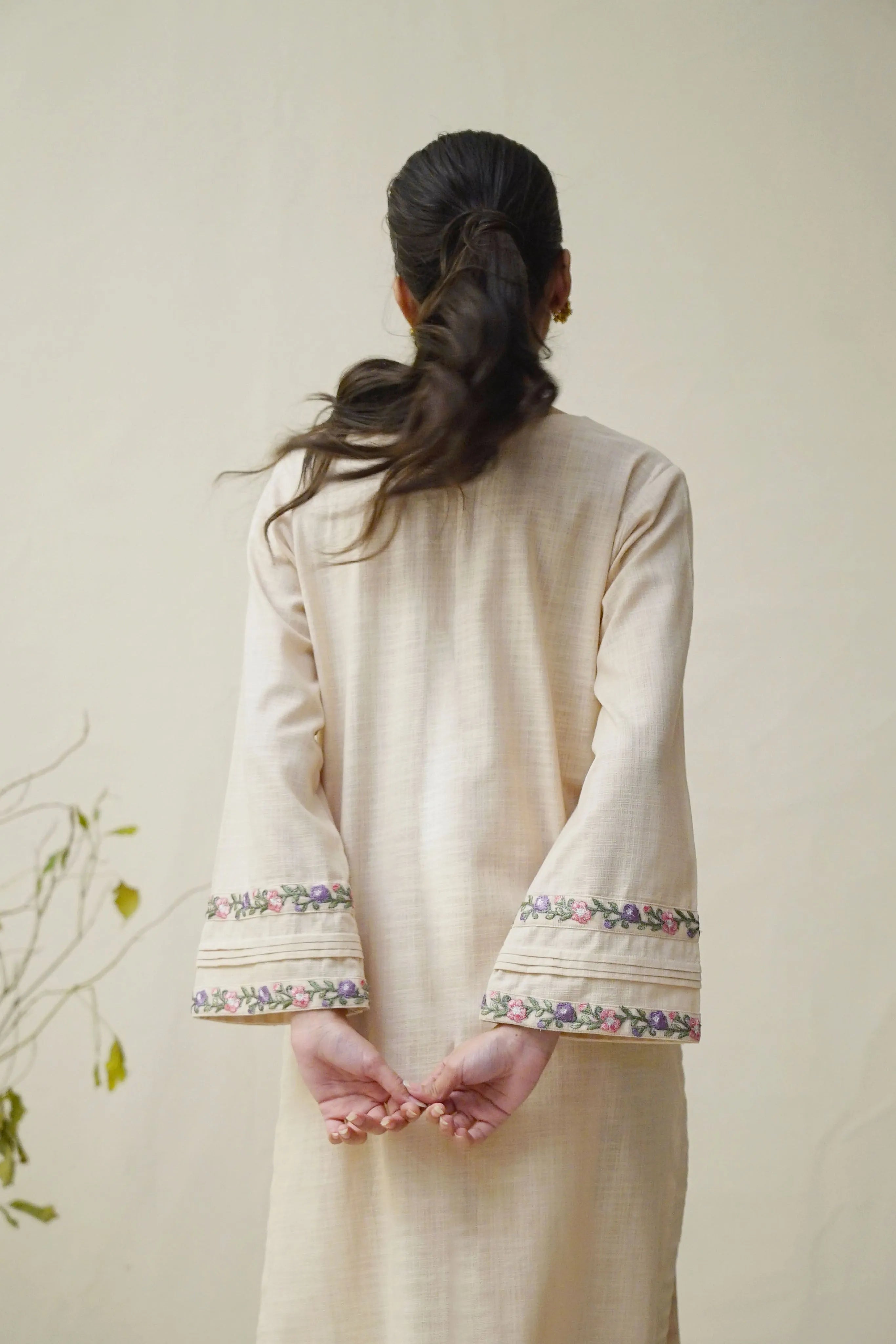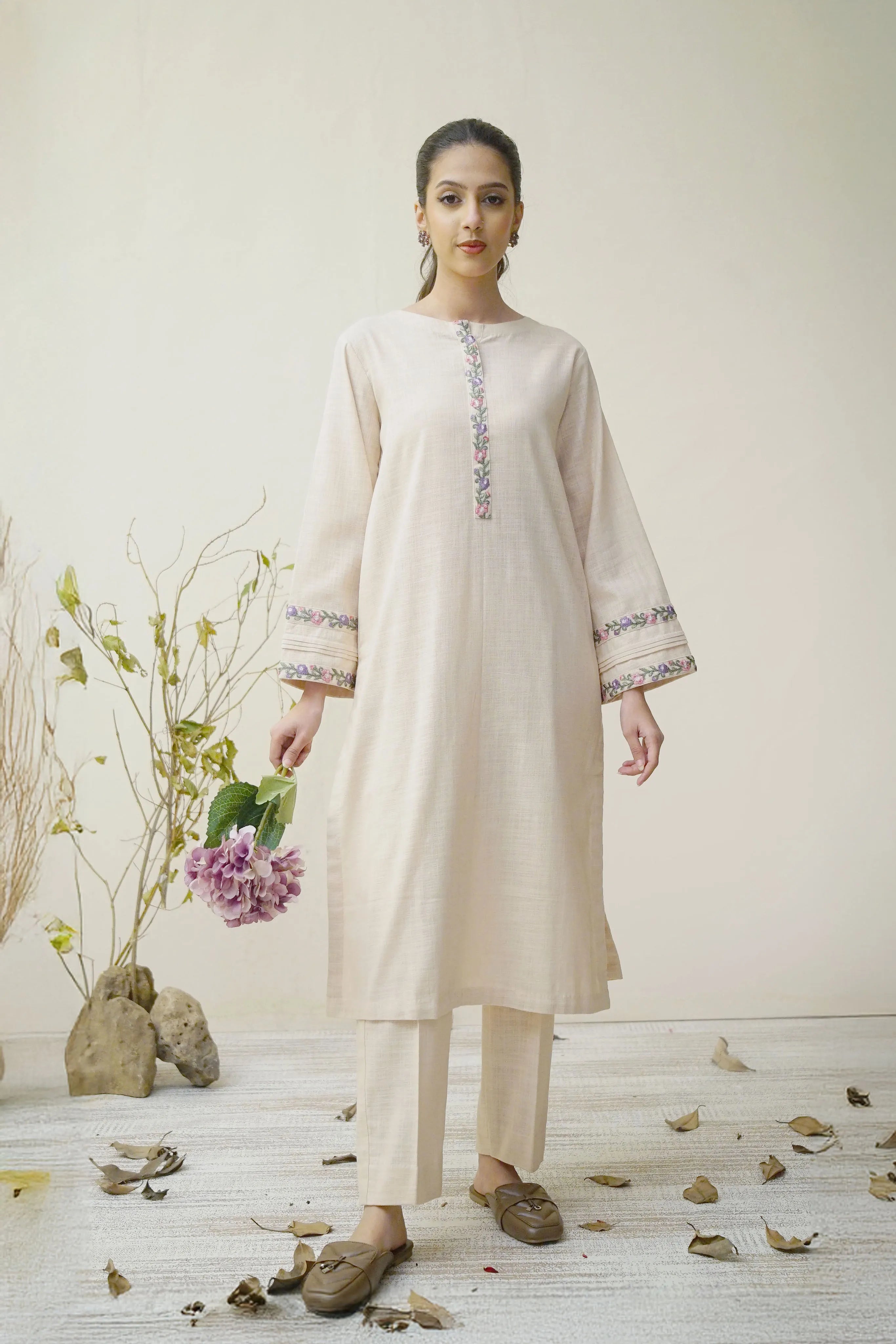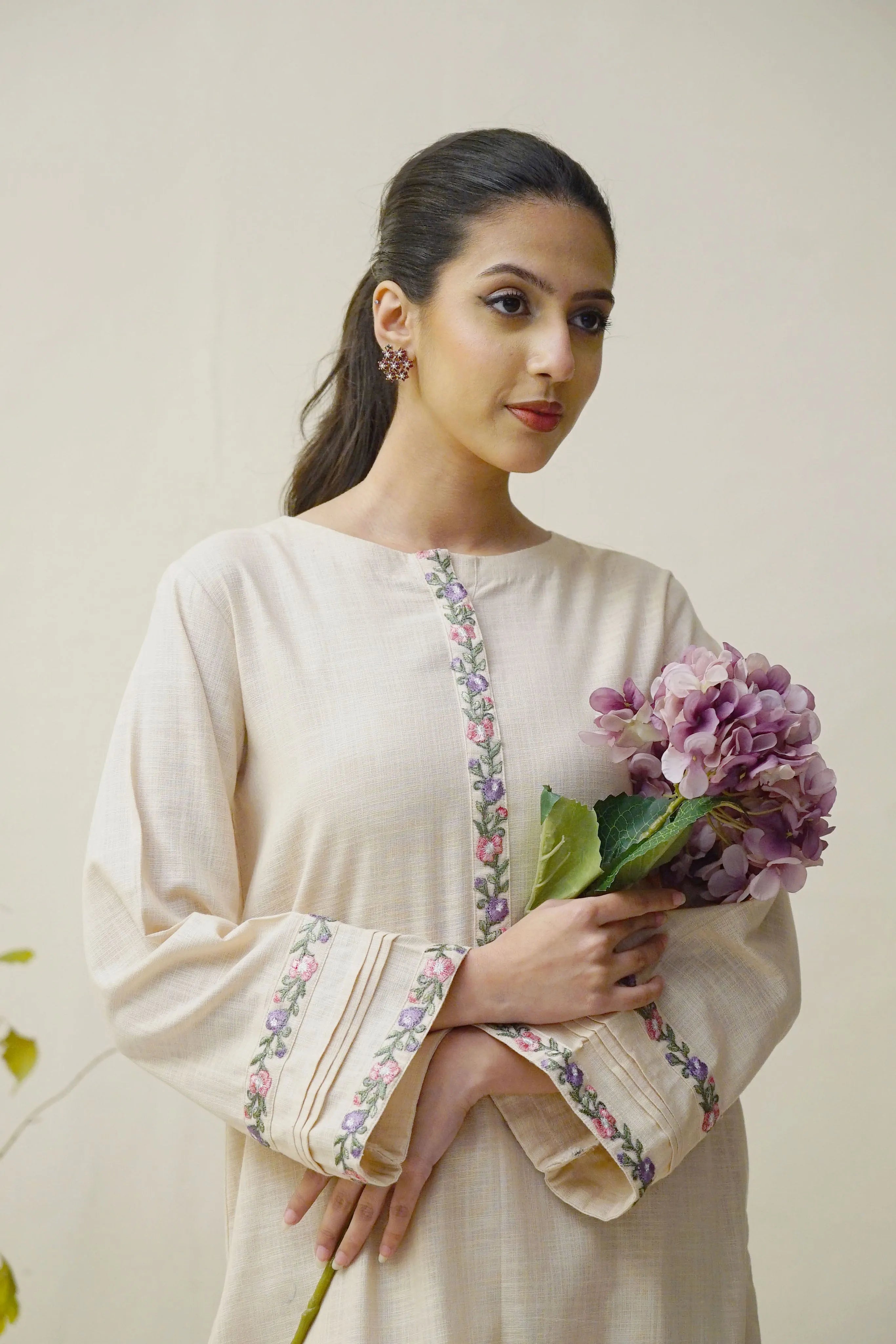 Shirt: Straight cut with embroidered neckline and sleeve cuffs