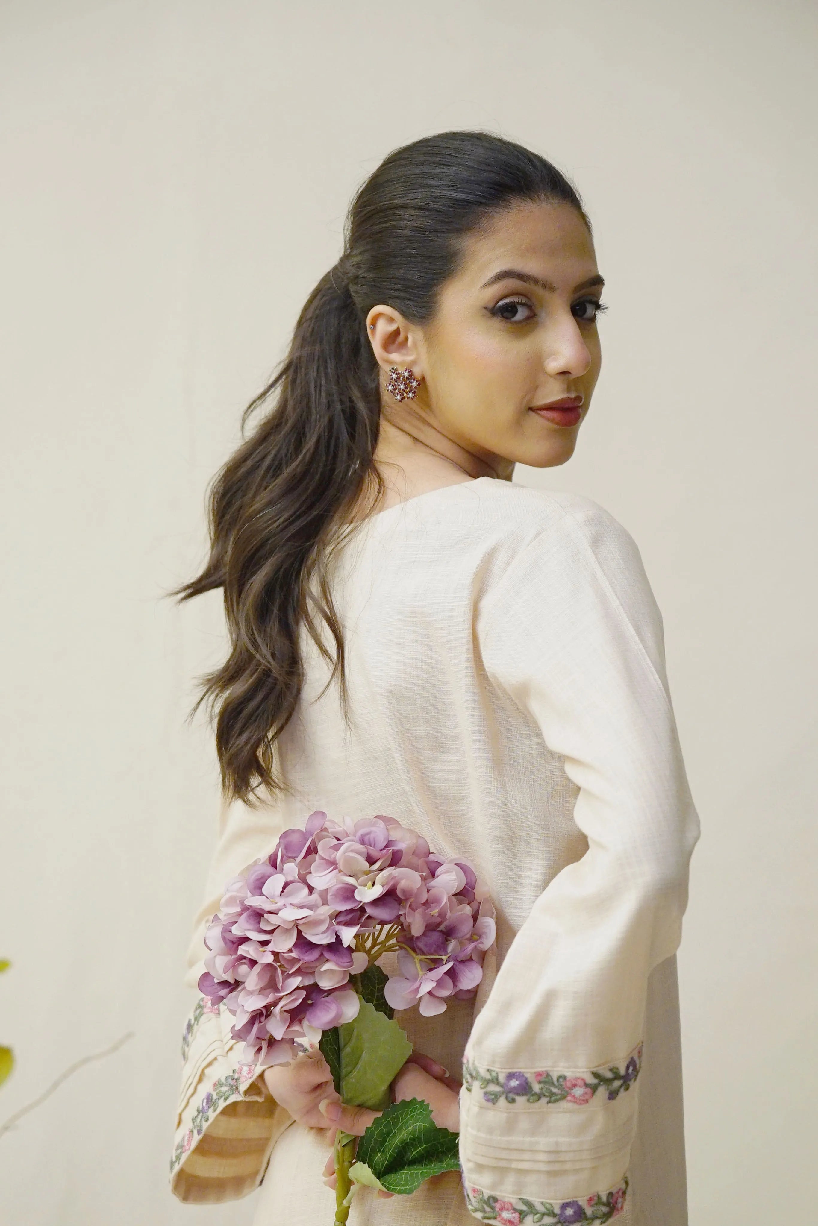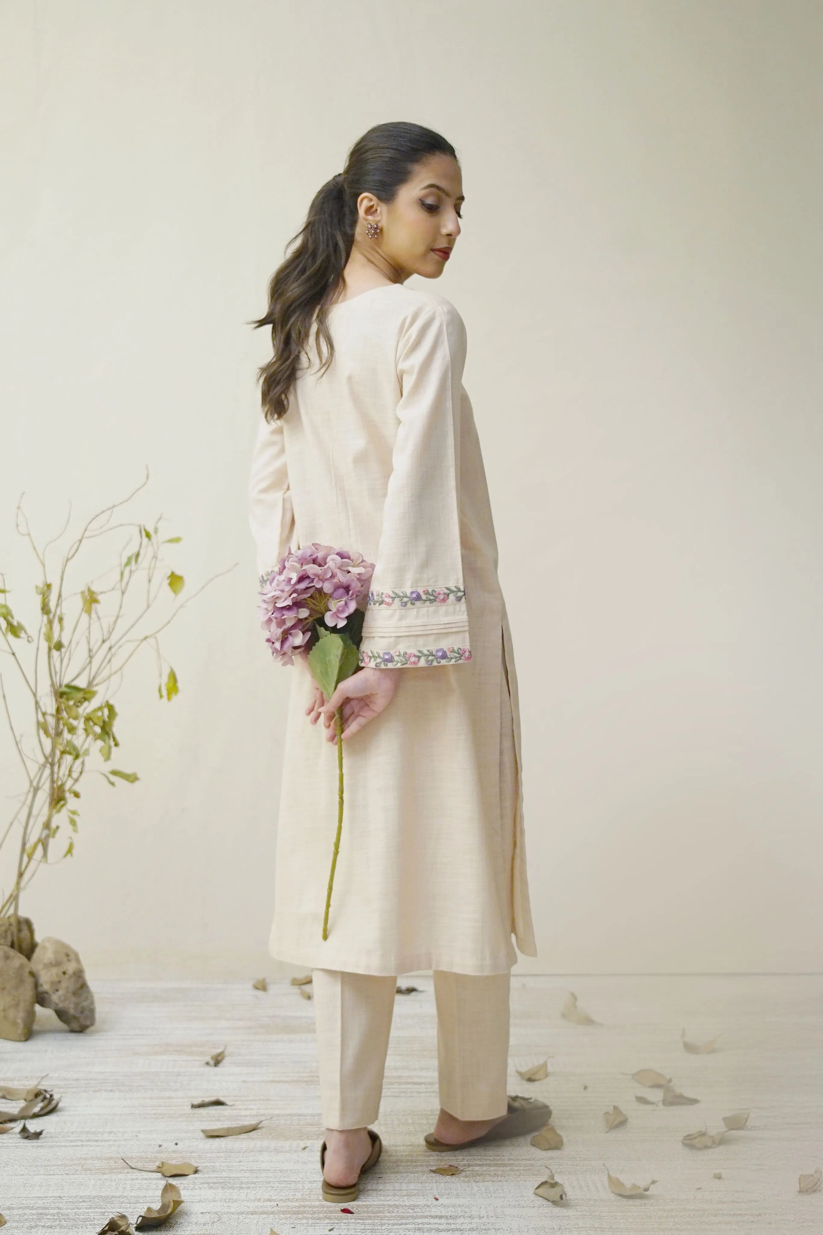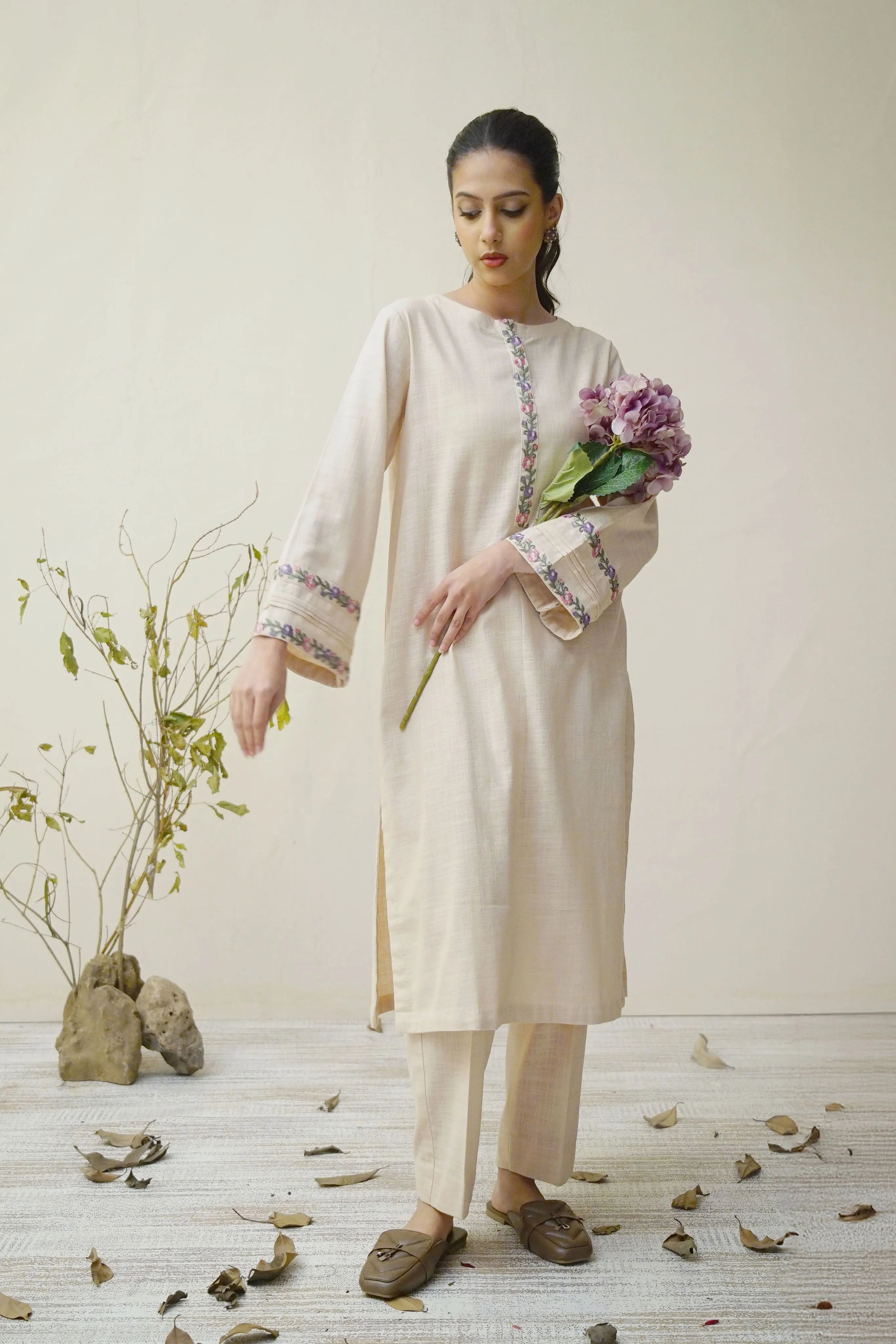 Shirt: Straight cut with embroidered neckline and sleeve cuffs