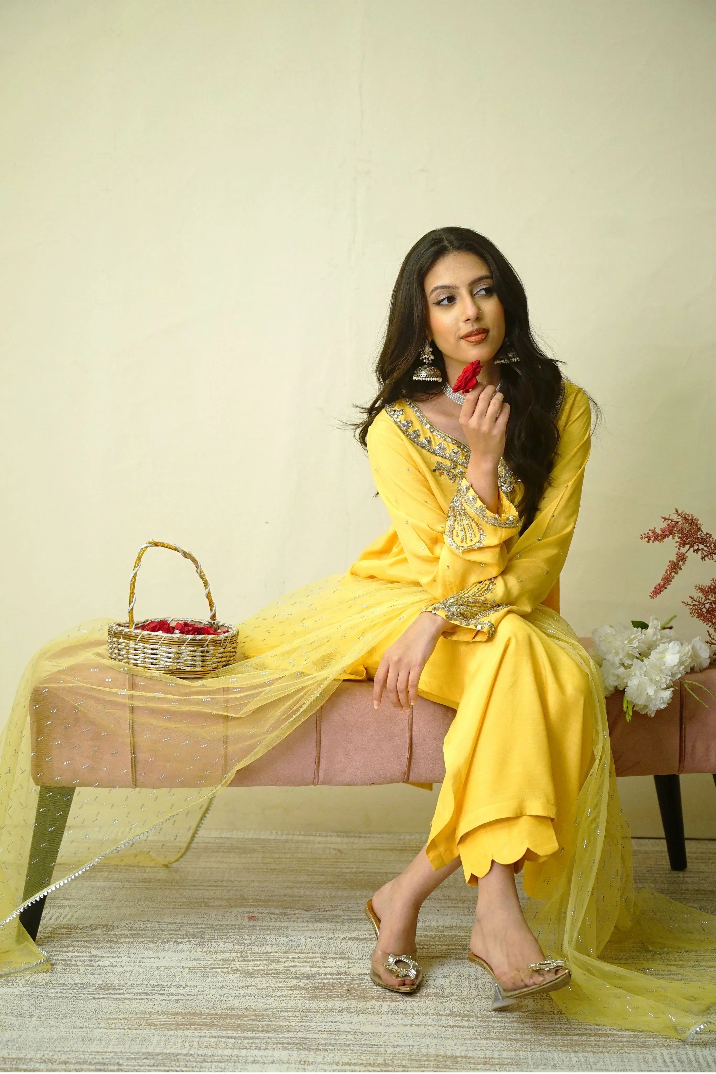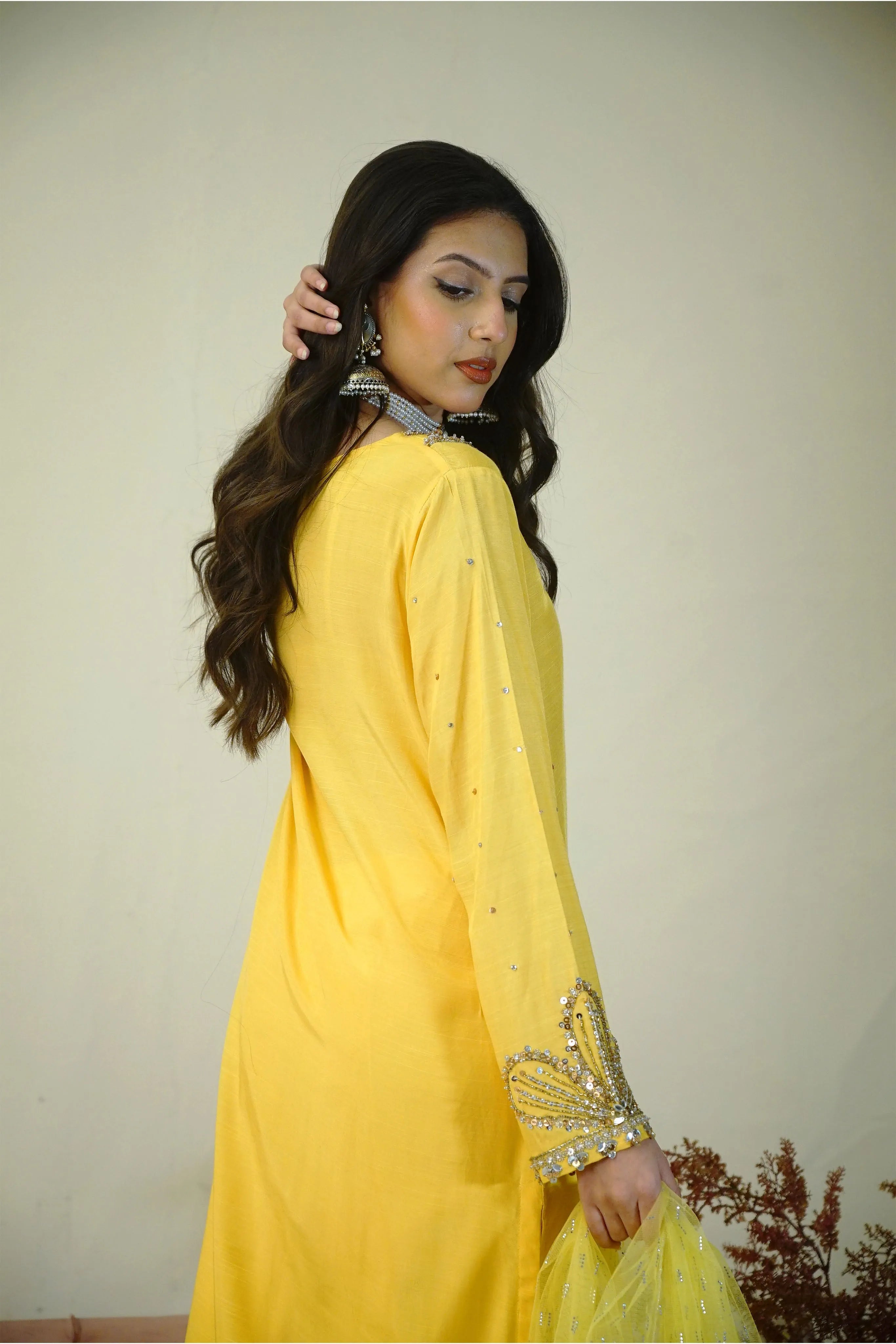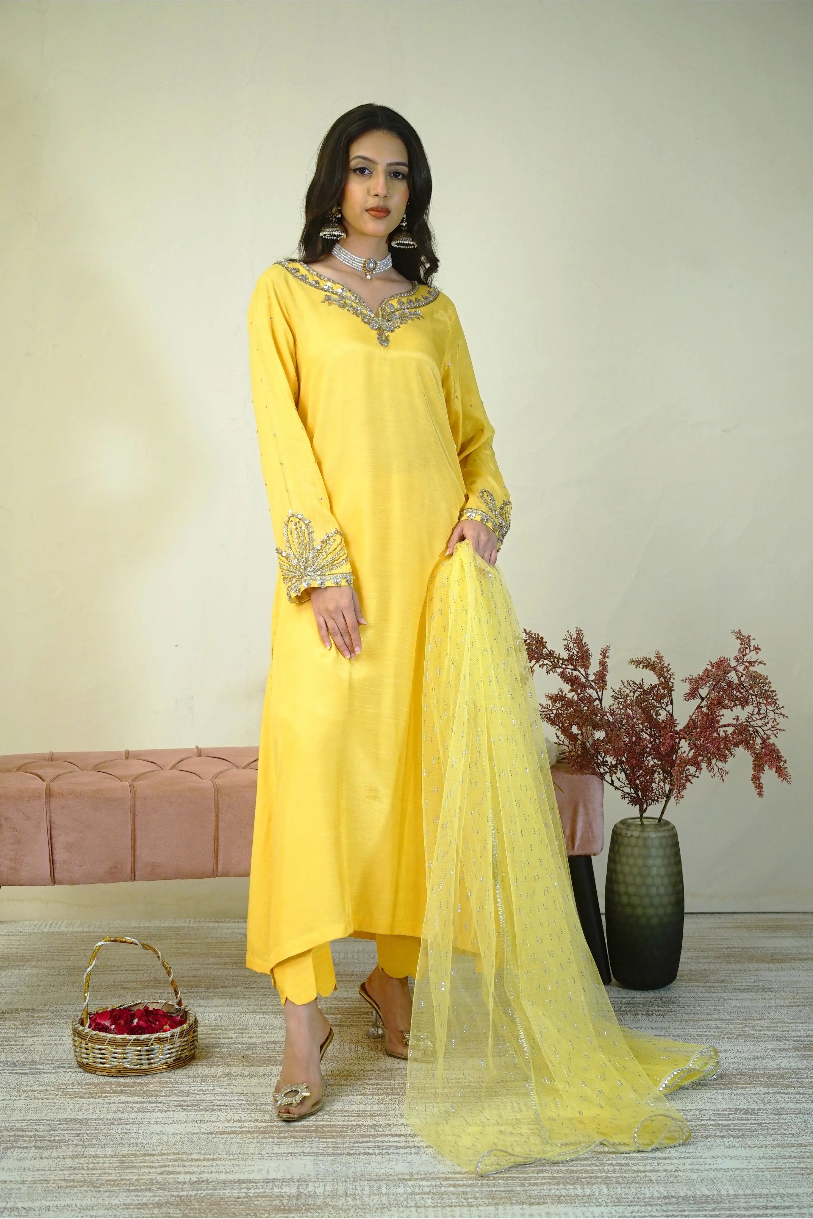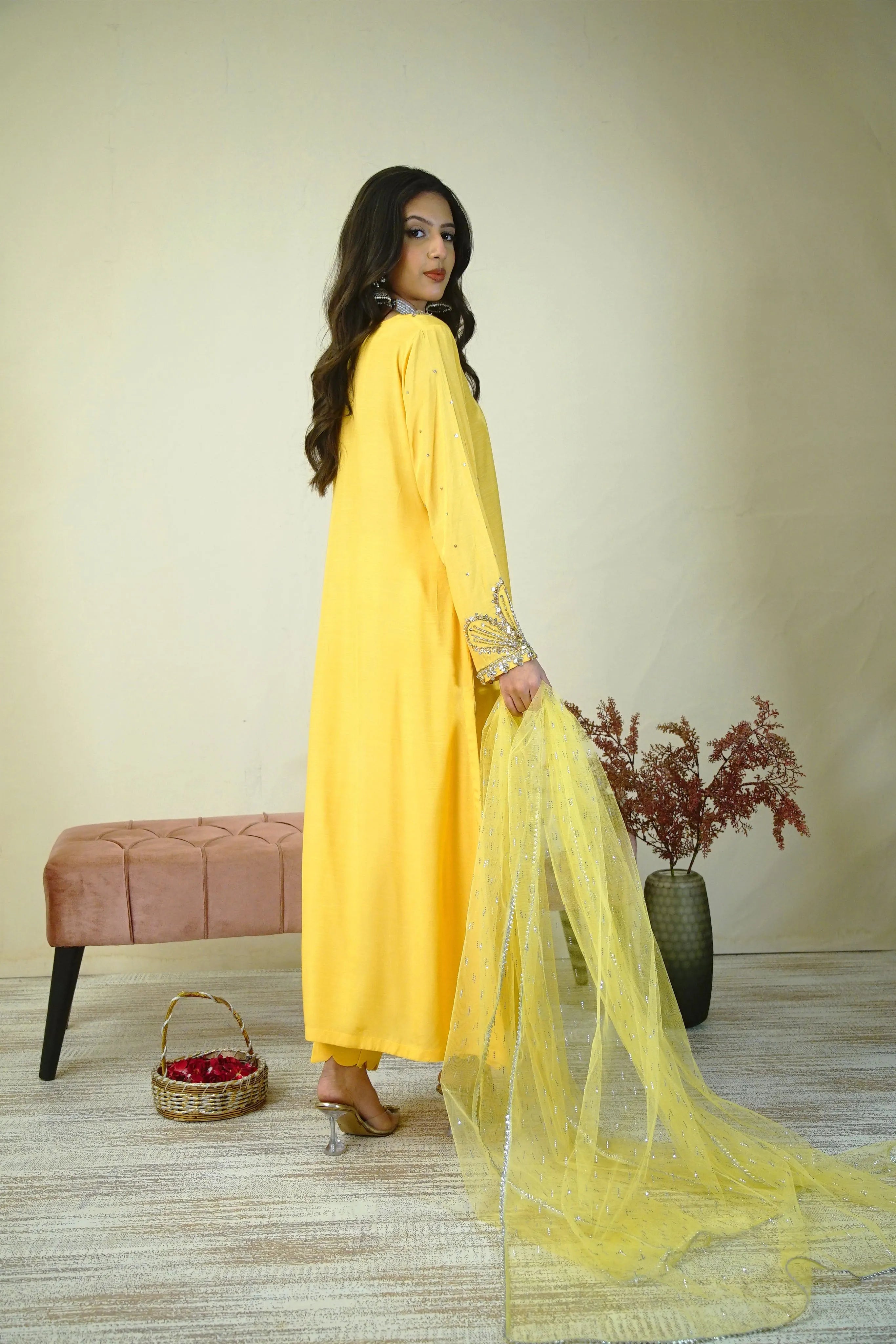 Solara is a festive ensemble in raw silk, featuring intricate handwork with sequins, naqshi, and dabka on the neckline and sleeves. Paired with tailored trousers and a net dupatta embellished with Swarovski accents, it offers a polished look ideal for formal events and celebrations.