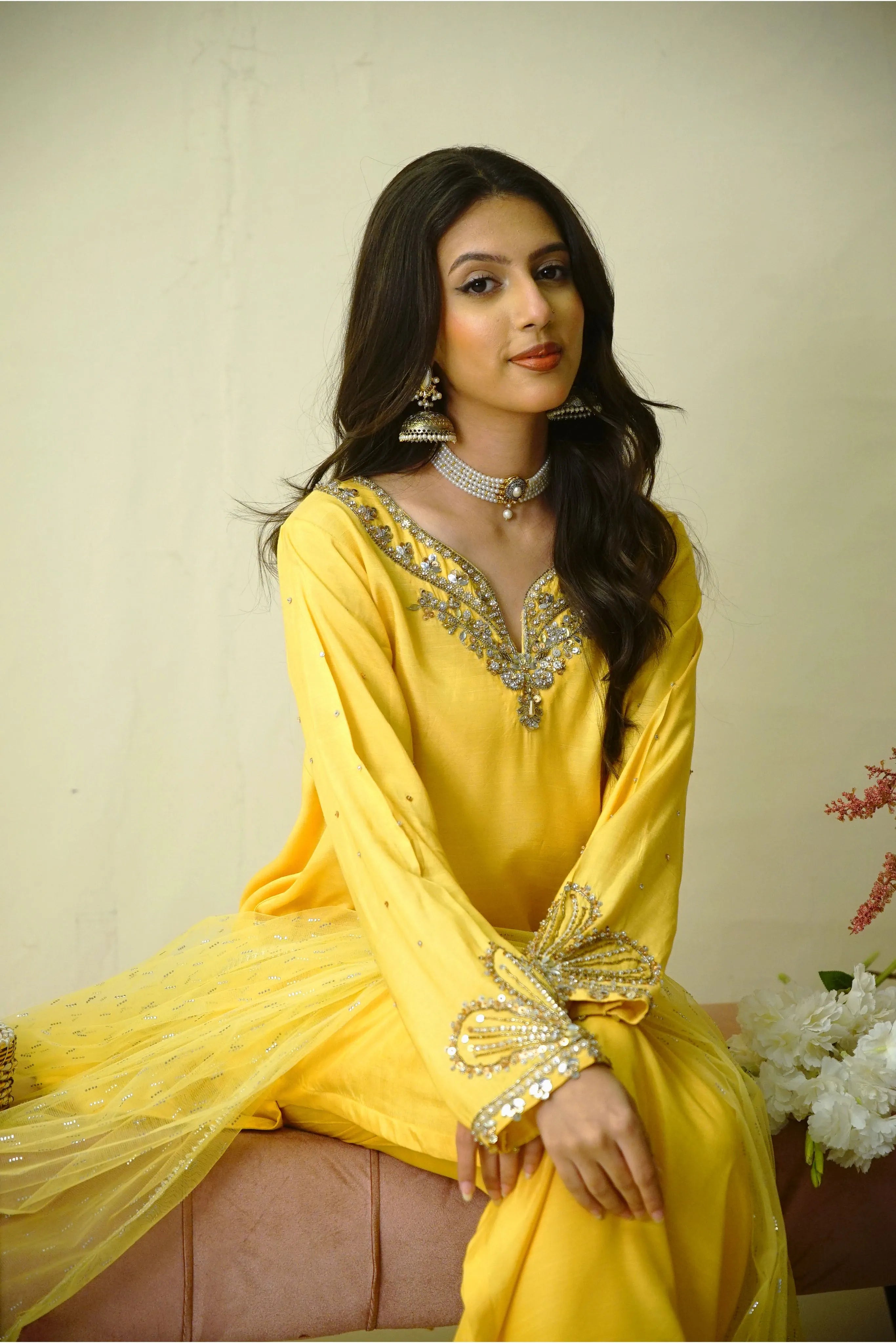 • Shirt: Staright Raw Silk Sillhoute Hand embellished neckline and sleeves with sequin naqshi and cutdanna