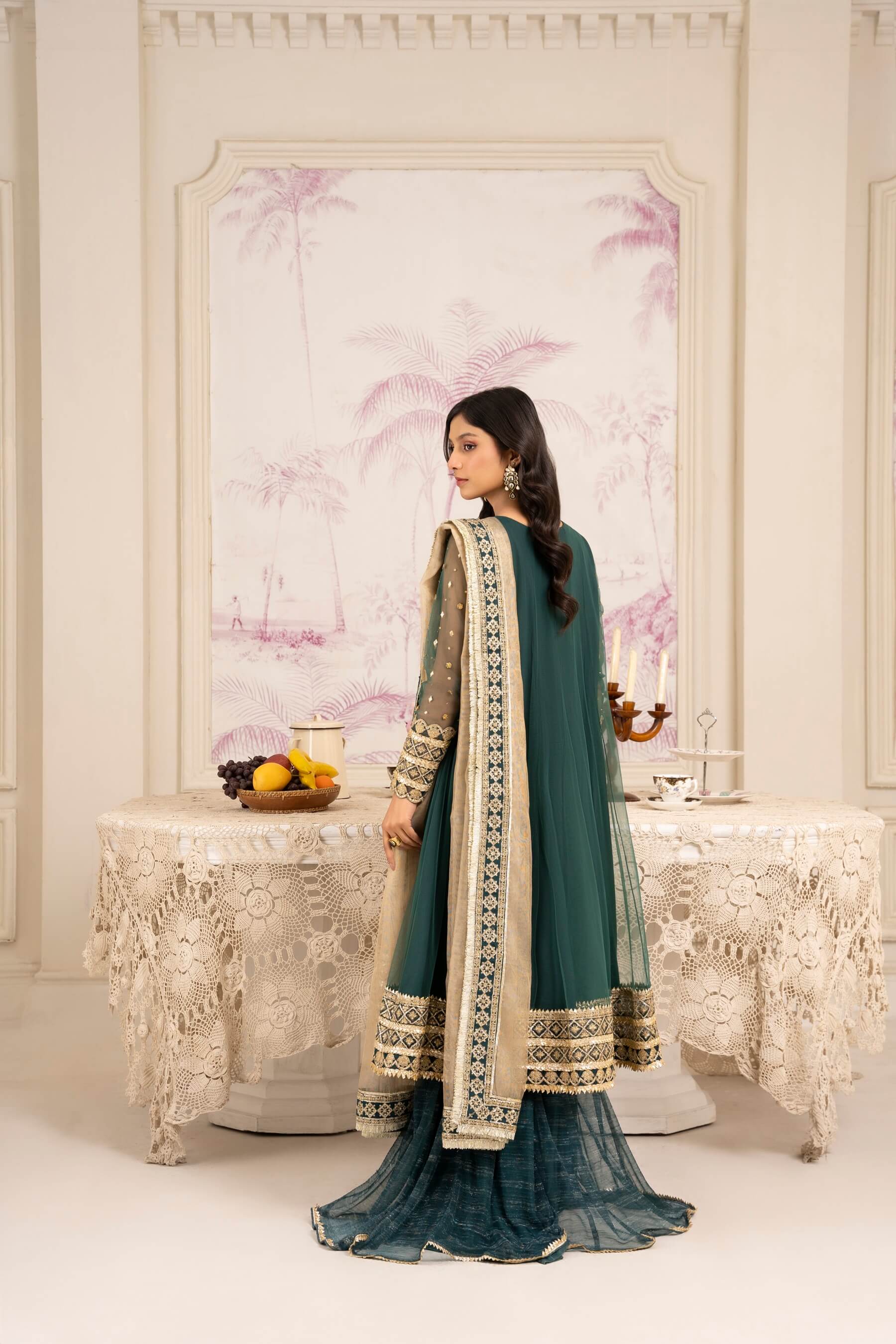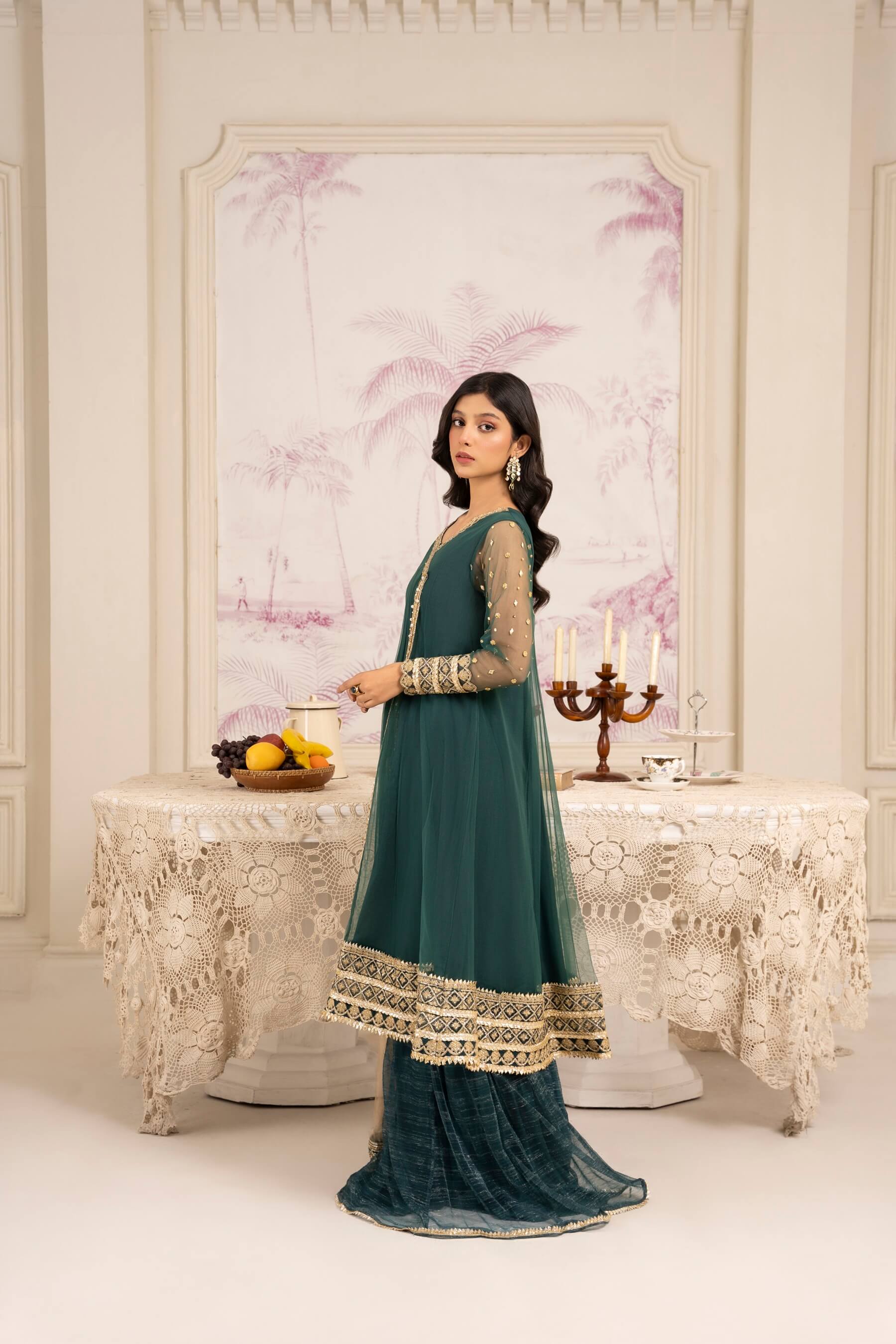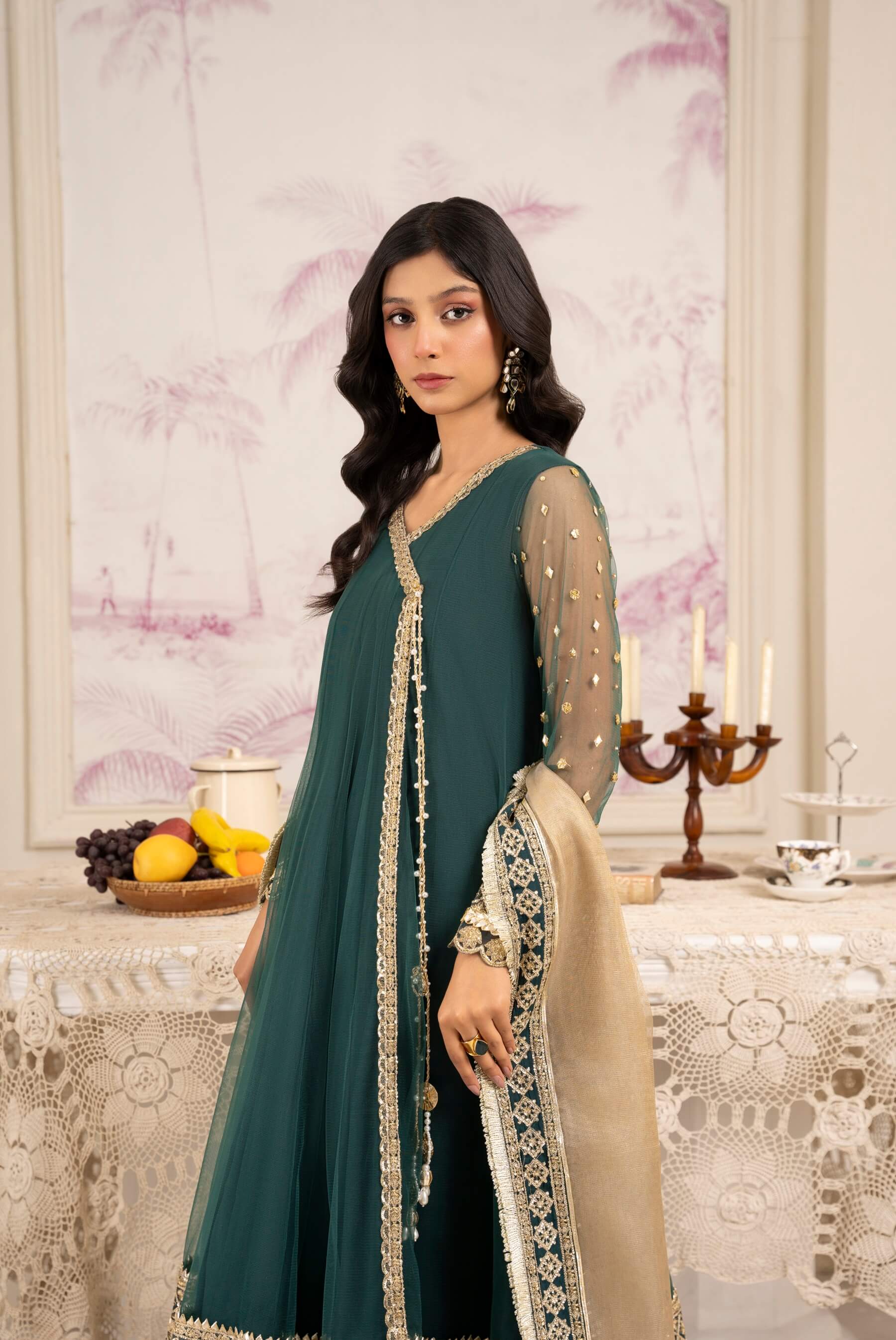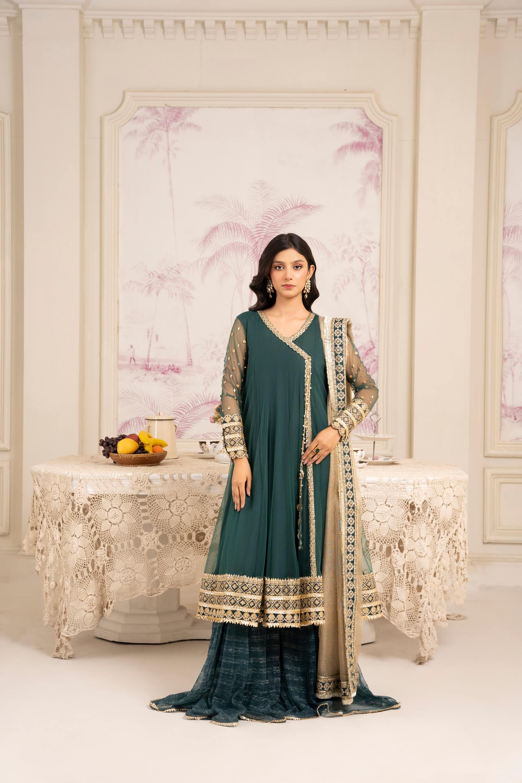 An Exquisite Teal Ensemble That Exudes Grace And Charm. The Long Embroidered And Hand-Embellished Net Angrakha Is Adorned With Intricate Zari, Sequins, And Gota Work Detailing. The Sheer Sleeves And Delicate Border Work Enhance Its Regal Aura, Making It Ideal For Festive And Formal Occasions Alike. Paired With A Beautifully Flared Lama Shimmer Sharara, Finished With Ornate Borders That Complement The Shirt's Embroidery, This Outfit Flows Effortlessly With Every Movement. The Look Is Completed With An Embroidered Zari Net Dupatta, Detailed With Fine Scalloped Edges And A Hint Of Shimmer, Lending The Perfect Touch Of Opulence.