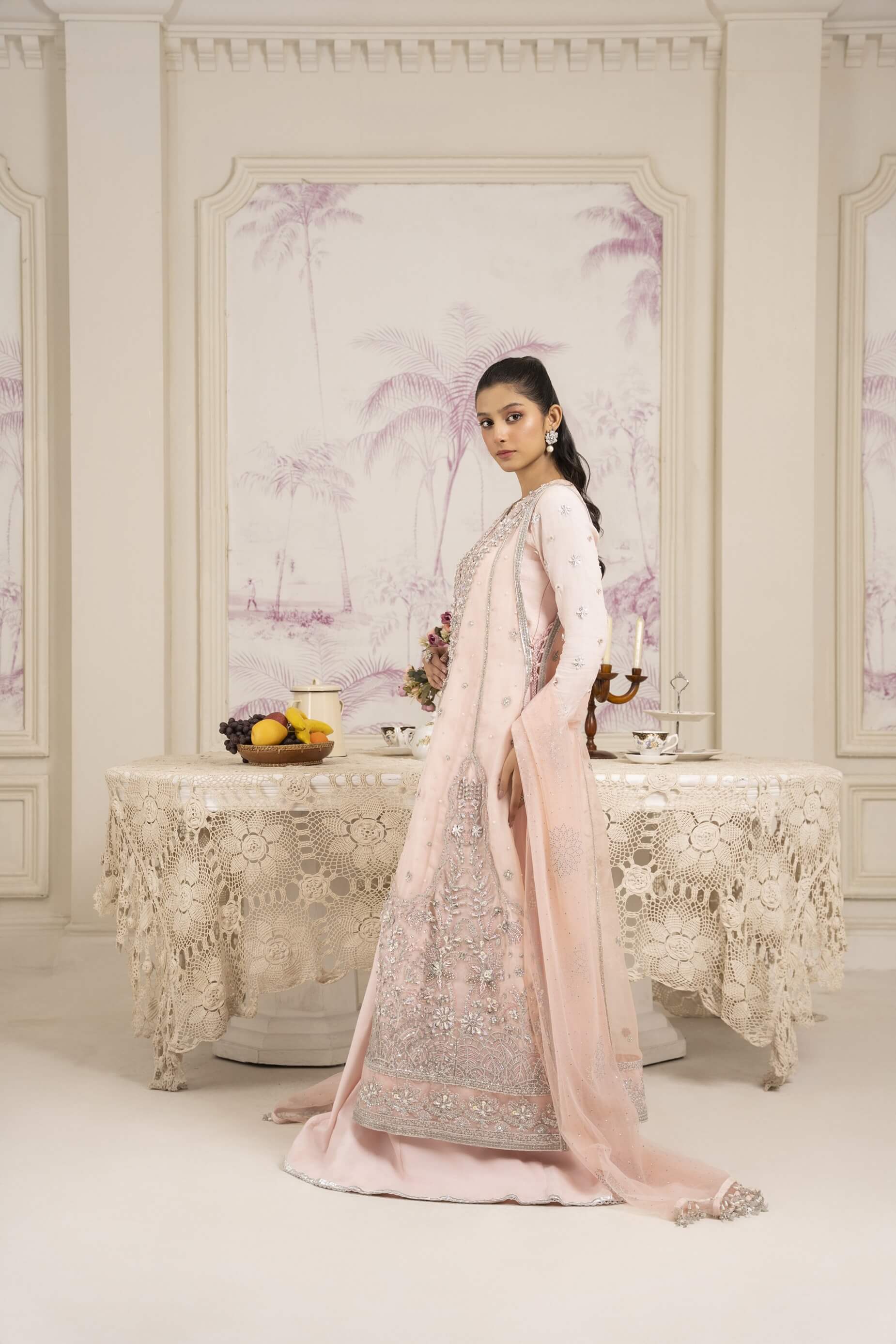 Blush Radiance is a long, hand-embroidered sheer organza shirt over a raw silk bustier, with silver detailing on the sleeves and shirt. It comes with a raw silk sharara trimmed with lace and a Swarovski-studded net dupatta, making it ideal for festive occasions or bridesmaids.